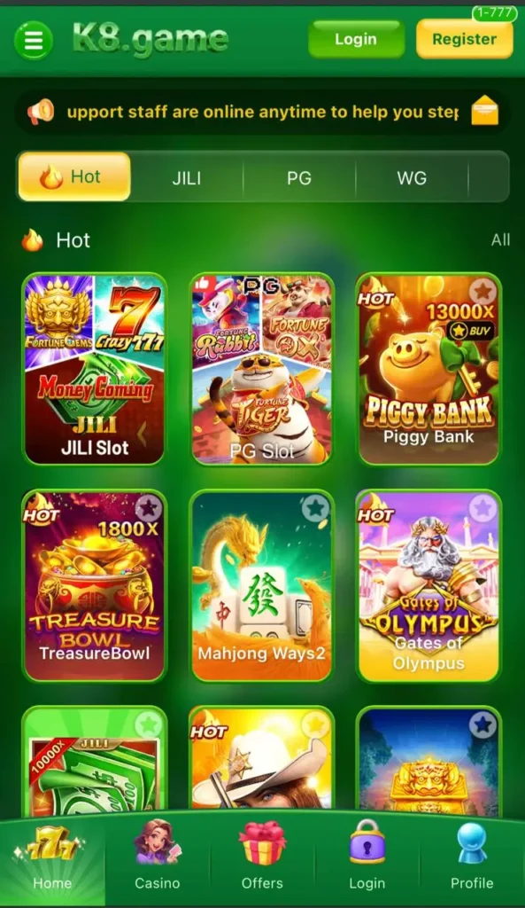 K8 provides slots, crash games, mines, live casino, and sports betting options for all. You can easily switch between luck-based spinning and strategy-based playing.
