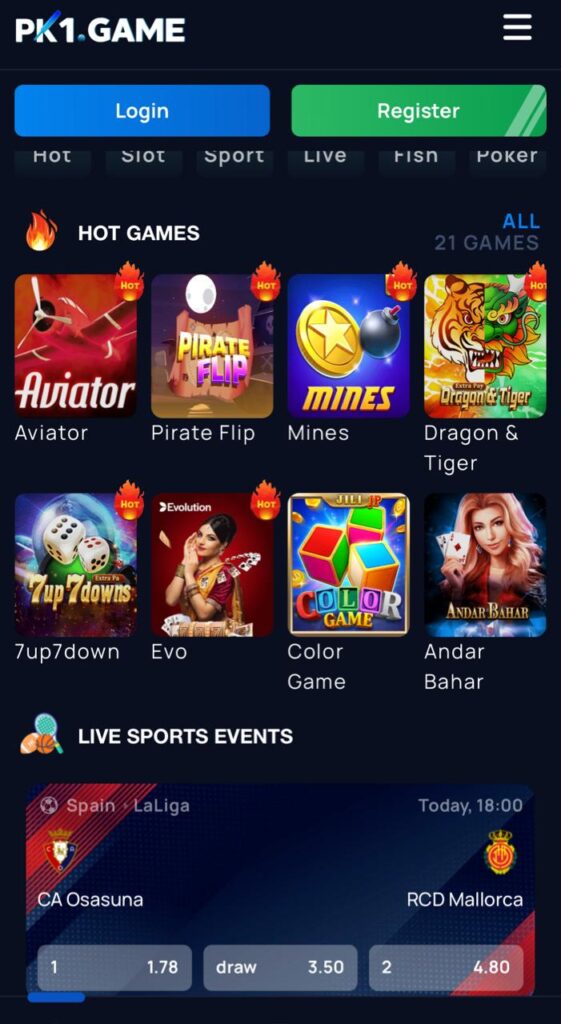 PK1 Game also brings you exciting opportunities like Slots for lucky wins and jackpots. Play Card Games like 3 Patti and Poker for brainy challenges. Fishing Games give you the chance to catch big fish with explosive thrills. Explore Live Casino for roulette and blackjack thrills with live dealers.